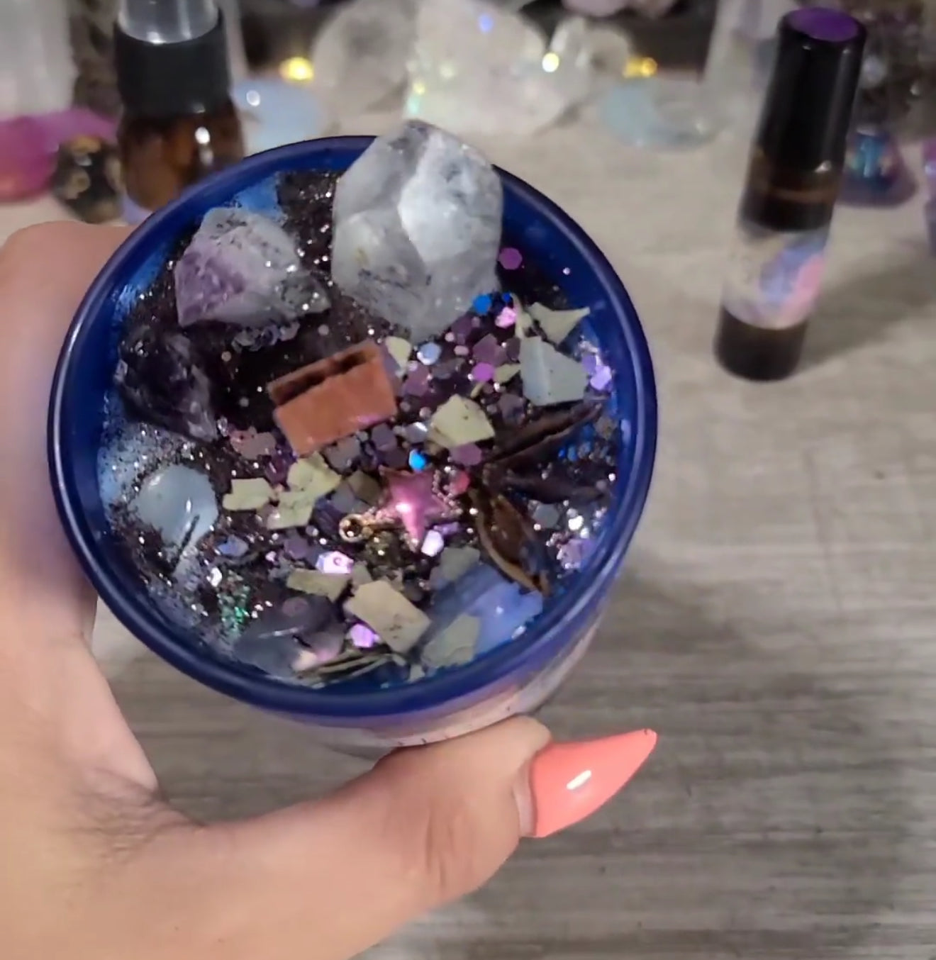 🕯️ Starseed Candle – Hand-poured and infused with crystals like amethyst and quartz, herbs, and cosmic shimmer to open your third eye, deepen meditation, and activate spiritual awakening. Burn during rituals, dreamwork, or stargazing for heightened intuition and connection to the cosmos.